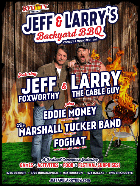 Your every day music festival may want to take notice of what is coming our way this summer! The team of Jeff Foxworthy and Larry the Cable Guy are putting on what is sure to be a fun day with their Backyard BBQ show dates! The festival will showcase the comedic styling’s of Jeff Foxworthy and Larry the Cable Guy, along with musical performances by Eddie Money, The Marshall Tucker Band, Foghat and more. Now the musical acts will vary depending on the city, so make sure to stay tuned for all of the bands announced for your city.